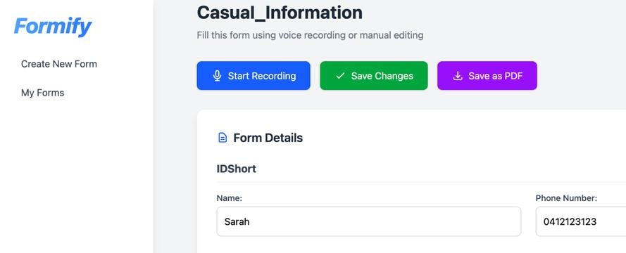 Formify automates tedious, manual form-filling with voice recognition! It uses WebSocket connections, real-time audio analysis, and mapping of natural dialogue into structured data to make interactions feel effortless.