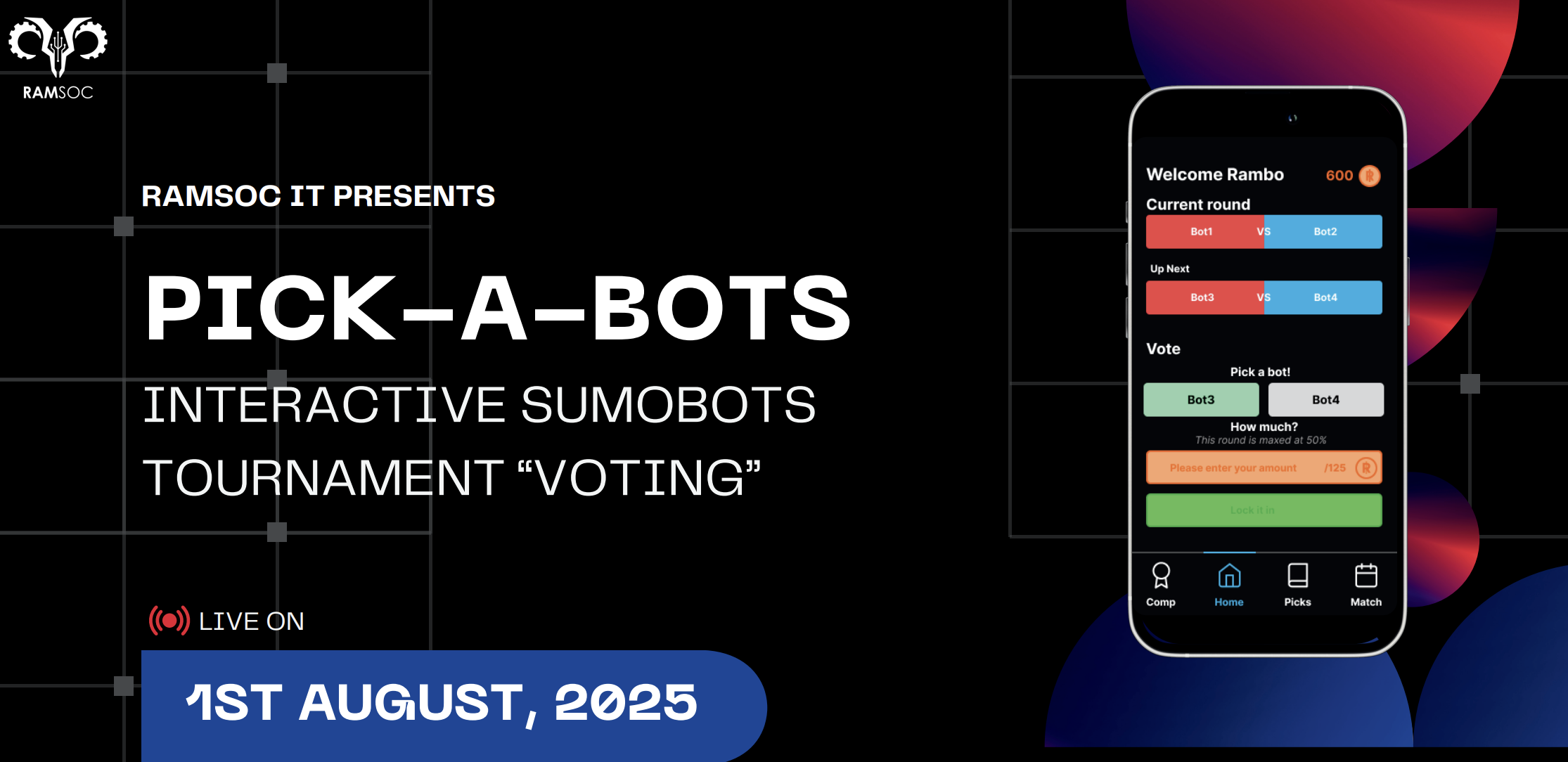 Pick-A-Bots is a webapp that lets RAMSoc Sumobots finals' audience “bet” on matches. Users starts with fixed tokens, stake tokens on their predicted winner, and earn tokens for correct picks.